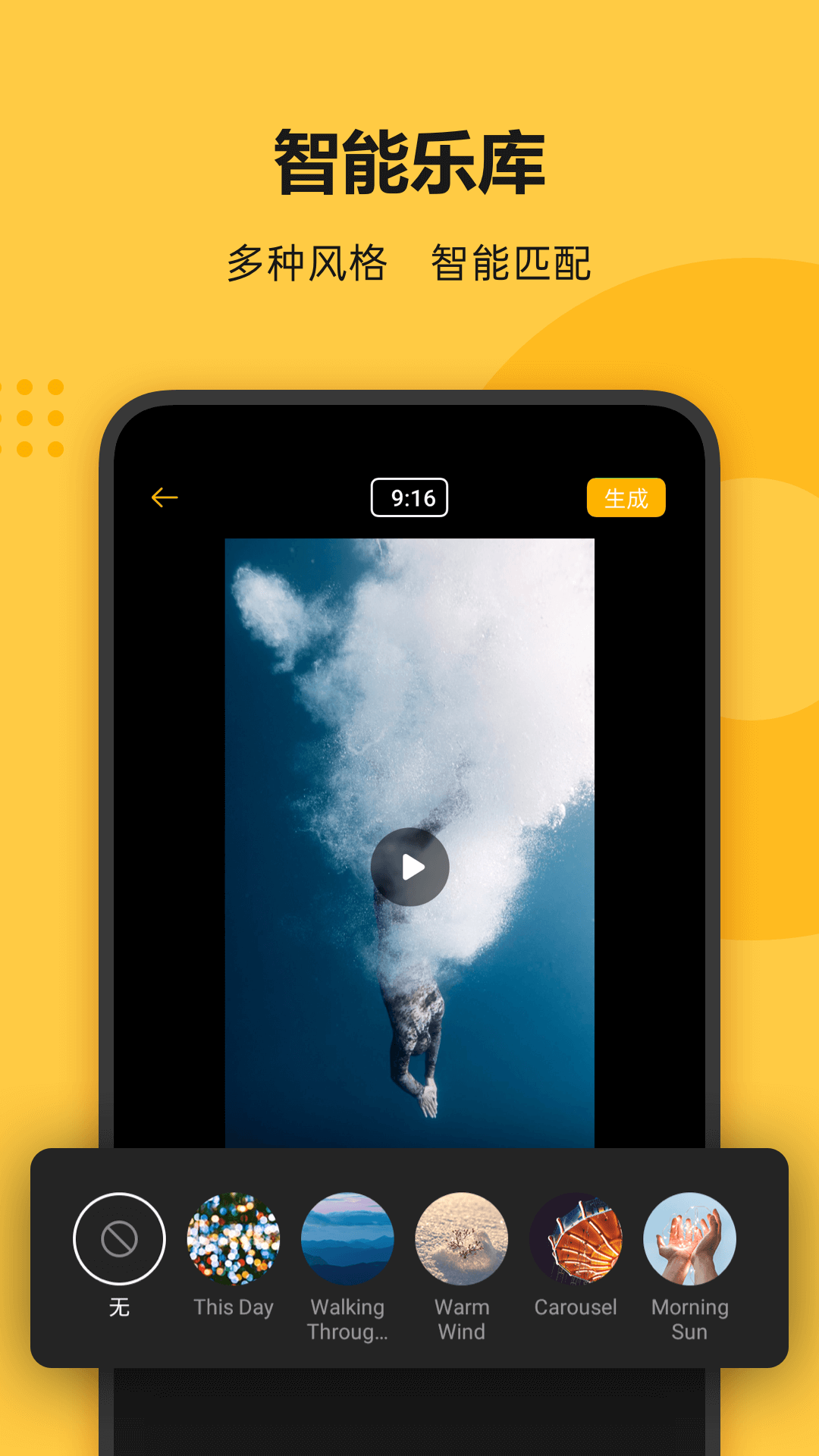 5.智能乐库,多种风格智能匹配,为您匹配到精彩的故事生成高清大片,从中挑选不同风格的音乐,找到适合该视频的精彩配乐;