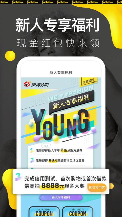 微博分期app提供线上潮爆尖货,带给您值得信赖的品牌保证,正品购物,享受丰厚福利,新手也可以得到更多现金收益,是一个年轻人潮流购物分析平台,这里分期商城有大多数大家年轻人都喜欢的货物,感受精彩的线上购买体验,省心使用和购物。