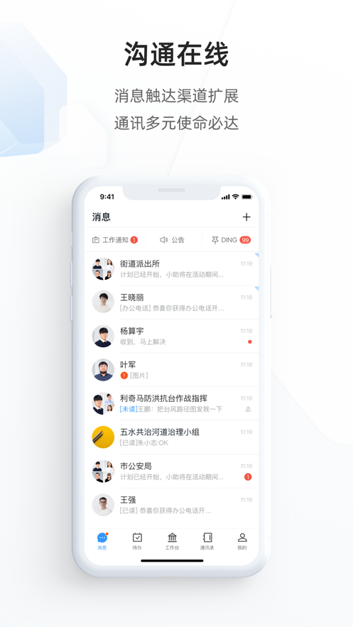 政务钉钉app提供统一的线上组织和沟通效果,带来办公型消费场景,通过各种方式寻找组织和途径,让您感受到高效的对话沟通方式,实现消息必达的消息类型,支持群聊和其他类型的聊天等,拥有统一的入口和不同层级的个性化配置。