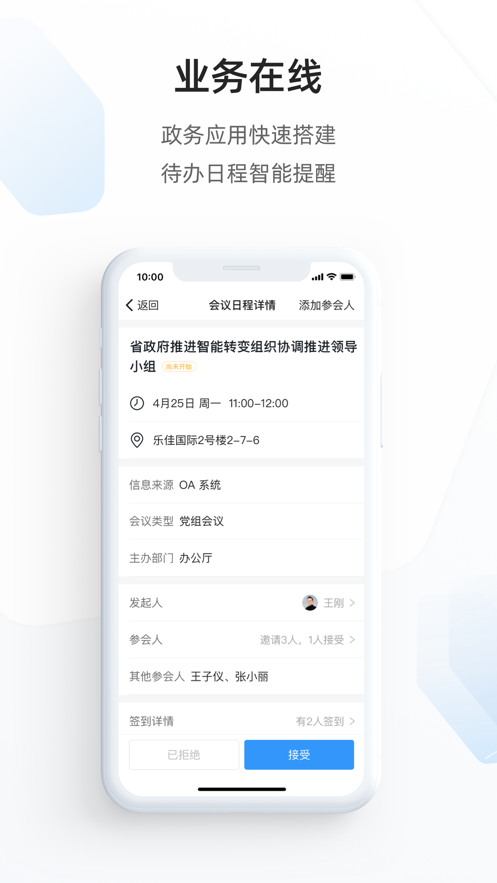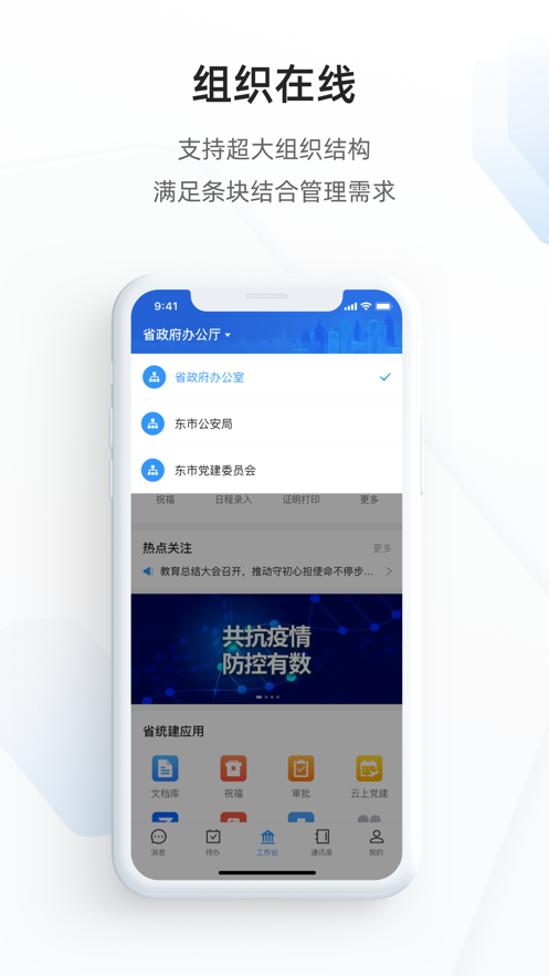 1.支持会议、事件等各类型的应用合辑,分角色定制工作台,切换不同的身份进行个性化配置,通过身份结合实现管控;