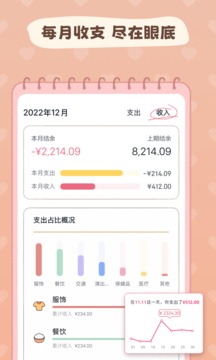 2、每月收支账单一目了然,统计图表帮你快速分析消费情况,自定义每日记账提醒时间;