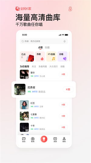 全民K歌app是一款让你来这里可以找寻更多的音乐来演唱,专为喜欢唱歌的小伙伴打造而成,使用手机能进行K歌,在这里用你的声音去征服别人,真正的离线卡拉OK场景方面取得了良好的进展。