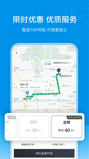 2、最快速:平均13分钟内代驾司机就会到达,我们为您准备了“云”呼叫中心、高密度司机布控。APP直接显示离您最近的5名司机,随即呼叫,立即响应。