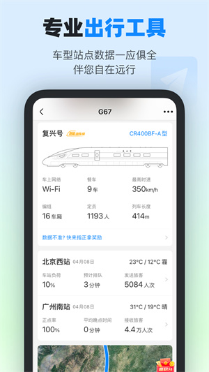 - 轻松管理「我的行程」,实时查询列车动态,停运、晚点早知道;