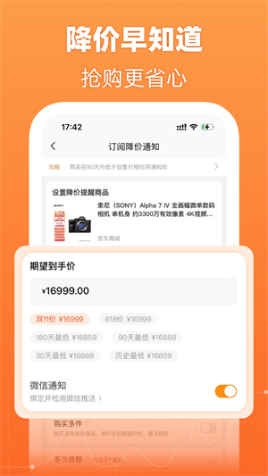 智能订阅关键词推送,从上千条折扣中为您推送感兴趣的优惠商品,轻松实现特卖监控,不再错过商品打折信息。