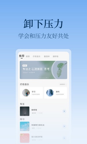 实用主义:四大压力场景:放松、舒眠、静心及振奋;3种人声+23种氛围音乐+7种脑波音乐+独立控制,超实用的视觉型呼吸学习方式。
