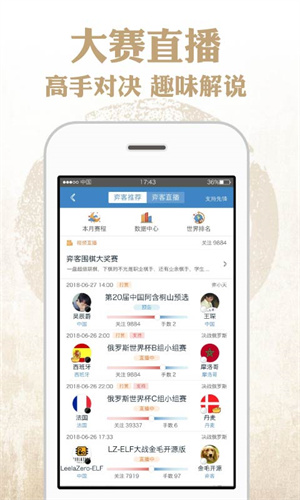 【关注世界比赛】围观大赛直播、与职业解说互动,获取时时的比赛新闻和棋手资讯。