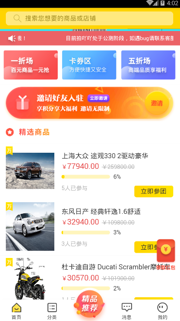 这是一款采用全新拼团模式的购物软件,你可以使用拼团的方式来竞拍你想要的东西,如若没有拍中,钱款则会返还到你的账户中,资金安全有保证。商城内所有商品经严格筛选。保证您以低价获得优质商品。