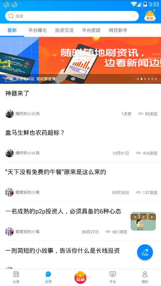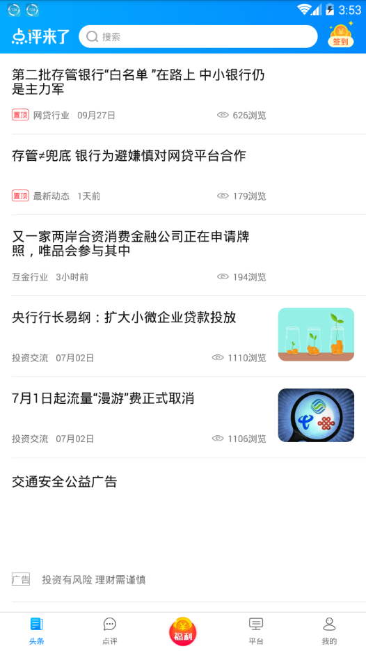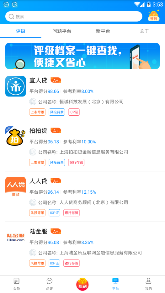 点评来了app提供最新最全的丰富资讯,有着评级档案快速查找平台,p2p的社区理财平台,还有律师在线,维权不用担心。是您投资理财路上的好帮手。