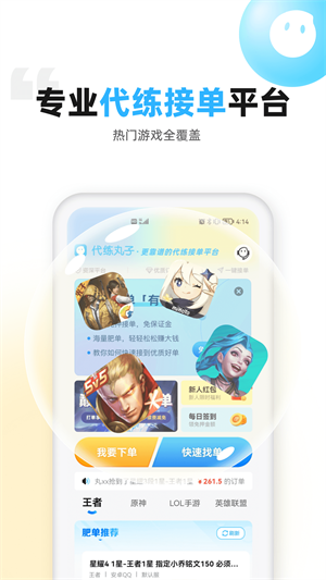 3、软件会大幅度降低新用户接单的门槛,应有尽有的游戏代练服务都可以来满足你的;