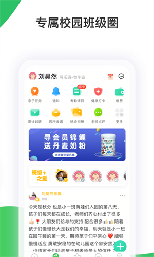 家长、老师发布的动态信息归集成圈子,家长也可以在圈子中发起话题,家长和老师均可参与话题互动,育儿经验真实,贴近生活实际,让孩子又多一位老师,让孩子的家长成为一群大朋友~