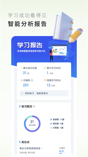 游戏化的闯关模式会来检验你的学习效率究竟如何哟~智能督促你的学习,让你的效率一高再高!