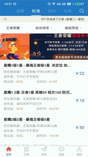 荣耀代练app是一款游戏账号给你选择体验的交易平台,拥有专业安全的接单服务,游戏代练给你不少的选择,信息交流的窗口在这让买卖双方直接沟通到位,接收上也是十分极速,搜索游戏名称来找。