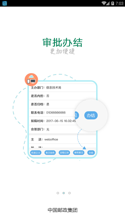 这是一款由中国邮政出品的官方手机应用,通过它可更好的帮助邮政员工惊醒办公,提高办公效率,可轻松的与同事进行交流,获得最新的邮政资讯,行业的动态等。有需要的朋友快来下载吧。