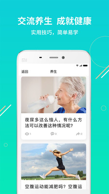 这是一款针对中老年人的健康社交平台,提供了丰富的健康知识讲堂,趣味视频,附近的人动态展示等功能,让中老年人可以更快捷的获取资讯。享受到移动互联网时代带来的精彩生活。