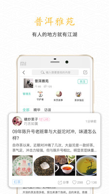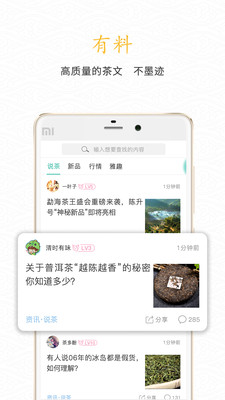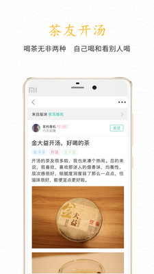 这是一款为茶友们而专门打造的互动交流社区应用,在这里你可以以茶交友,与志同趣合的茶友们一同交流茶,分享茶。社区不定期的举办派茶活动,不花钱就能品尝到好茶,快来下载使用吧。