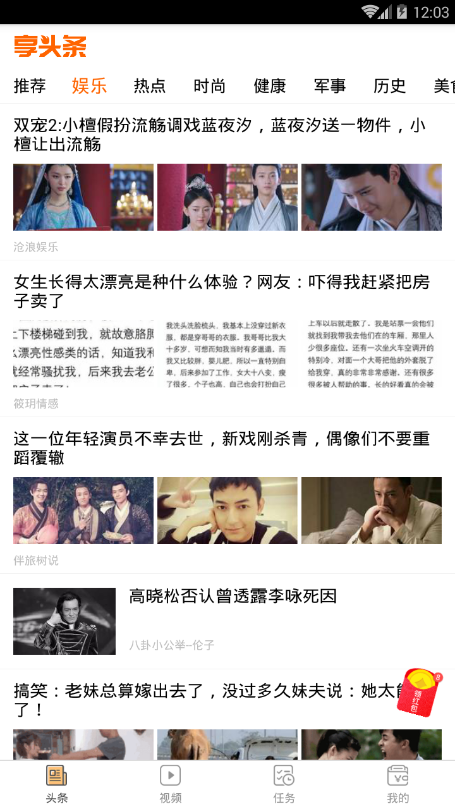 享头条app是一款好用的头条资讯应用,海量的热点资讯,头条视频,实时的更新推送,智能算法,为你定制专属的头条资讯。还可完成任务领取现金奖励,快来下载体验吧。