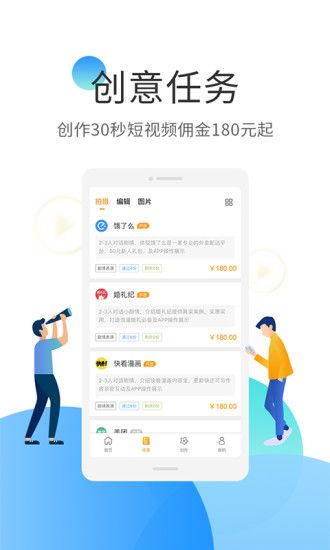 一款可以通过拍摄短视频来赚取佣金奖励的手机软件。用户在平台上领取任务,创作30秒短视频,推广即可获得金额不等的佣金,非常靠谱好用。