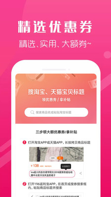 这是一款好用的购物应用,专注网购省钱,精选海量好物。便捷的搜索淘宝或是天猫的标题即可领取优惠券,下单抵扣使用实在的节省下花费。每日都有各种的折扣好货等你来选购哦快来下载体验吧。