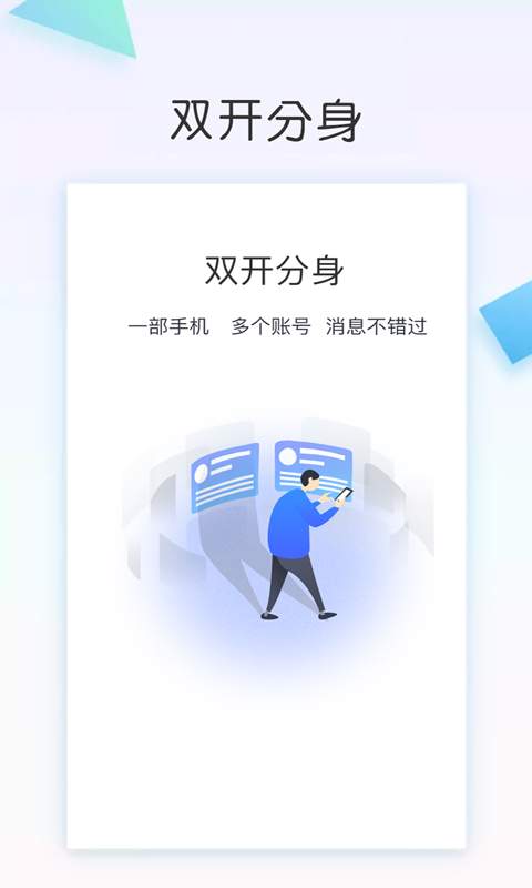 双开分身app是一款好用的应用双开应用,让您能够在手机上同时拥有多个账号,每个账号在各自独立的客户端里运行,之间相互独立,互不影响。双开分身,一个风格极简、干净易操作的软件,让您的手机拥有无限可能。快来下载体验吧。