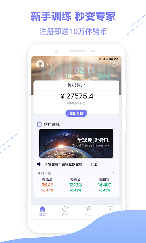 这是一款实用的期货行情交易应用,为用户提供全面的市场行情报价资讯,带领你深度解析行业的动态。更有专为新手而准备的模拟交易,注册即送10万体验币,带领你入门秒变专家哦,快来下载体验吧。