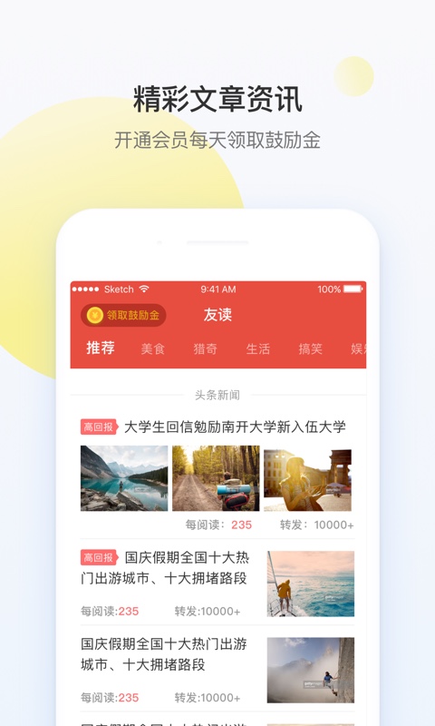 友读app是一款好用的新闻阅读应用,为用户汇聚各类热点新闻资讯,覆盖广泛的阅读面,很好的满足不同读者的阅读需求。会员每天完成阅读任务还可领取奖励金哦,快乐阅读轻松赚钱哦,快来下载使用吧。