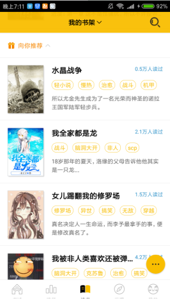 这是一款好用的小说阅读应用,在这里你能找到你想看的任何小说,原创小说,热血小说,轻小说都有,而且加上其强大的互动模式,让书友们一起互动找到好朋友哦,欢迎下载使用吧。