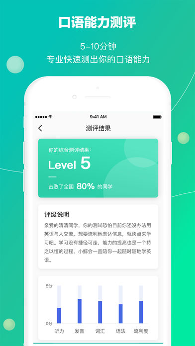 1.全新推出鲸小爱雅思模考板块,通过真实还原雅思口语模拟考试,获取专业的AI模考报告,从发音、词汇、语法、流利度和连贯性多纬度全方位对口语模考进行分析和解答,助你雅思高效提分!