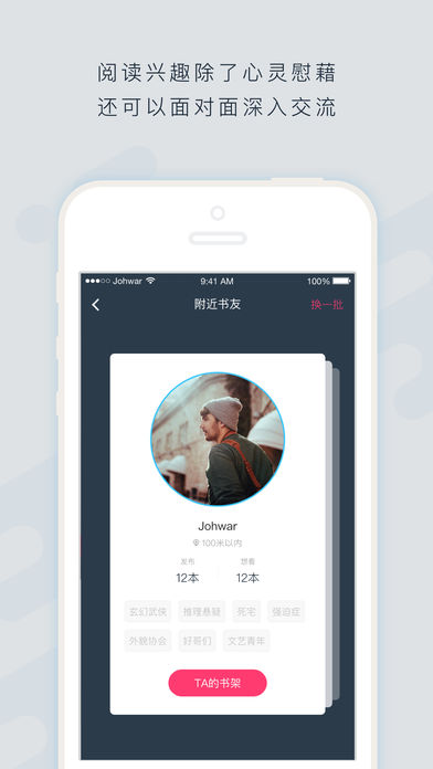 找到和你有相同喜好的“同类”;发现身边附近爱读书的TA,互粉吗?~