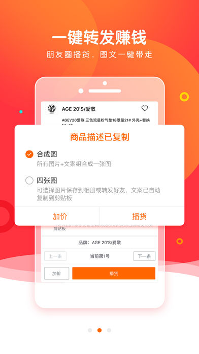 这是一款实用的代购应用。让您足不出户代购全球好货。小伙伴们再也不用辛苦奔波到各个国家采购了,而且还省了一大笔旅途开支;除此之外,用来做推广用的文案和精美图片,也都帮你准备好了,你只需要一键转发给好友、朋友圈、群就可以了,轻松赚钱。