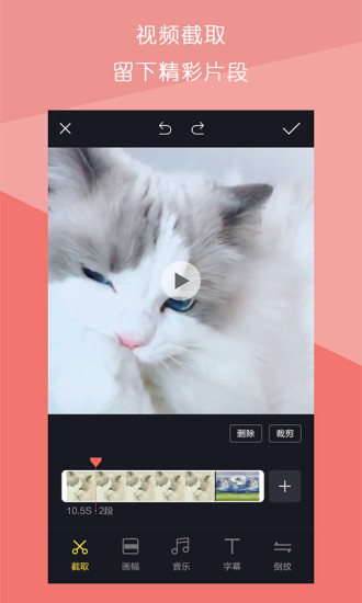 这是一款非常友好的视频剪辑应用,对于视频剪辑零基础的小白也可轻松进行短视频的制作,集拍摄、剪辑、字幕、音乐合一哦,轻松制作属于你的大片,快来下载使用吧。
