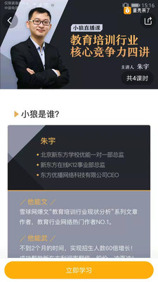 这是一款好用的针对教培从业者推出的在线学习平台。本平台通过提供干货满满的教培课程,相关的教材和系统,以及行业专家的专属辅导,致力于帮助大家完善知识结构、提升运营技能,从而成为教培从业者的创新型大学。