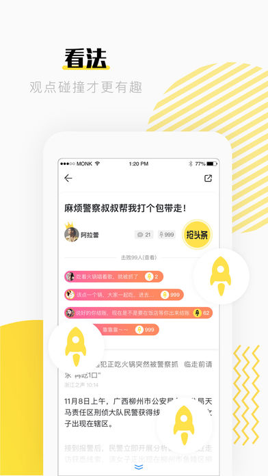 这是一款不错的资讯阅读应用,每天了解最新动态,发表上您对生活,对事物的见解,邀请好友送您“火箭”(点赞),获得属于您的专属新闻,与大家的看法一同PK,让我们来Battle!