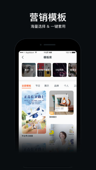 这是一款好用的短视频制作应用。各种热点视频模板,轻松制作,一键转发,带你玩转朋友圈!持续更新中~全新配乐配音功能上线,秒变MV,快速制作课程,高逼格模板,精致特效,让您轻松刷爆朋友圈、微信群!
