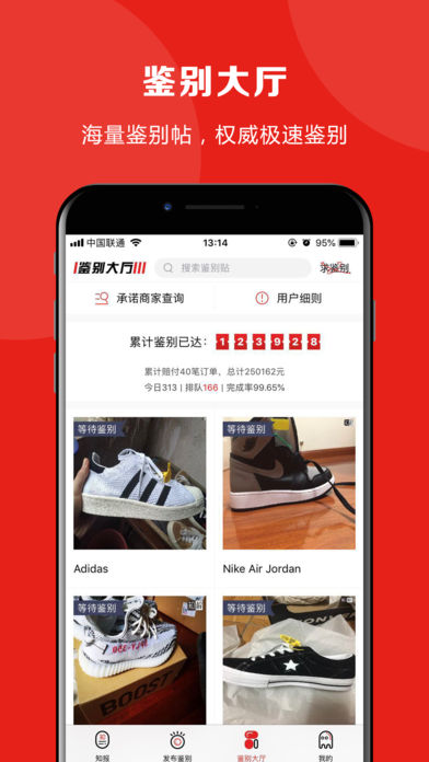 这是一款好用的鉴别运动品牌真假的软件。具体功能包含:知报,鉴别大厅,发布鉴别,我的鉴别等功能。让您对鞋上瘾!力求成为国内最具权威最值得信赖的鉴别平台。