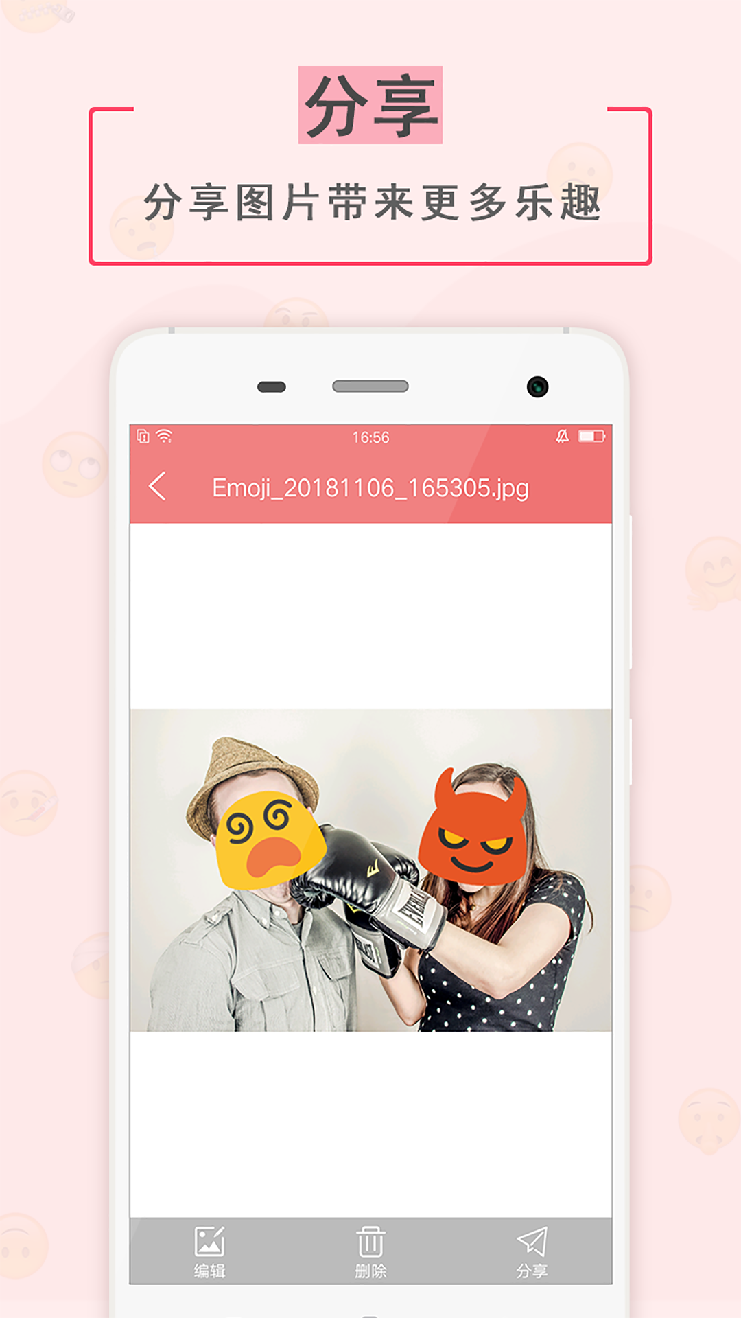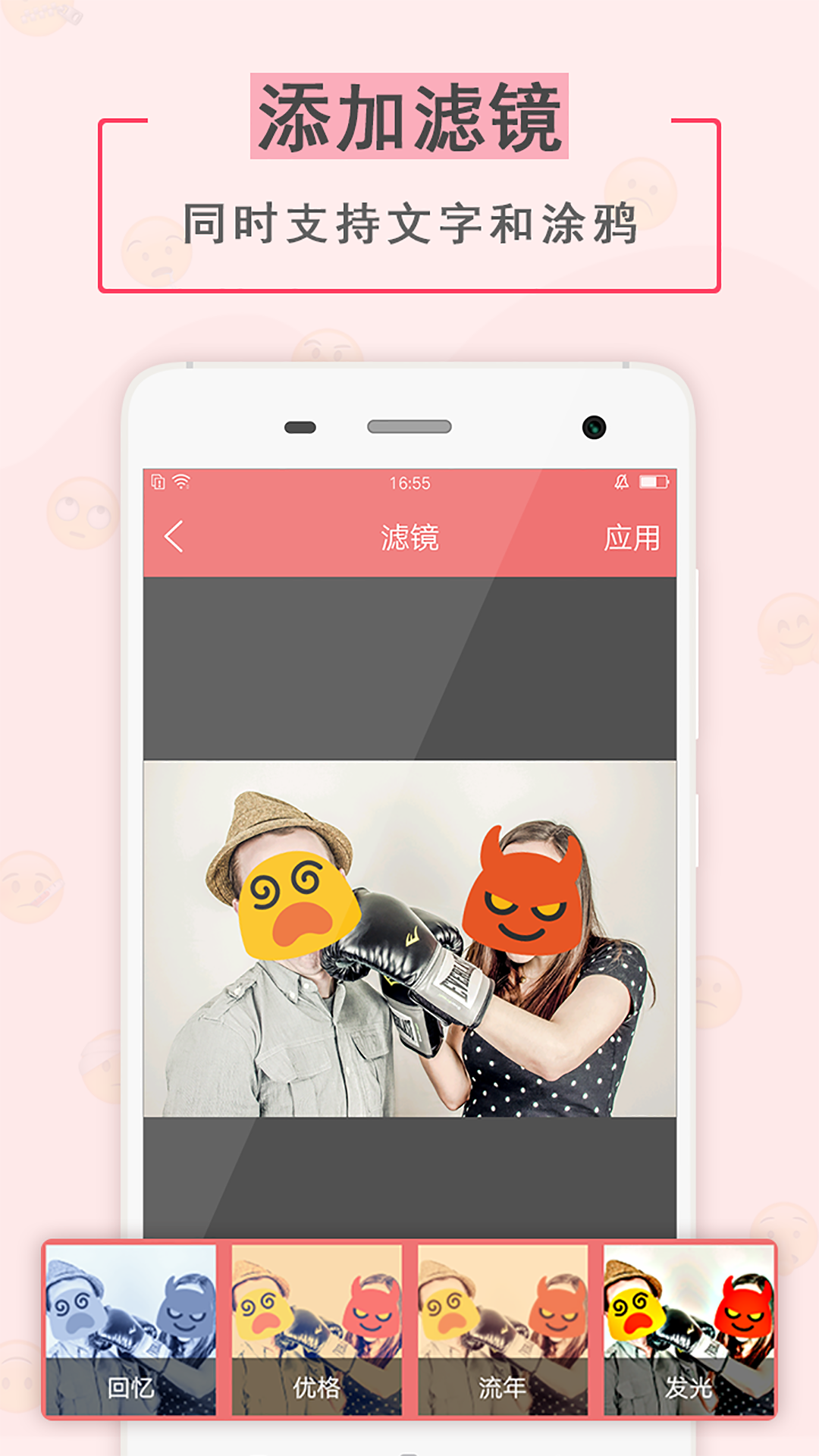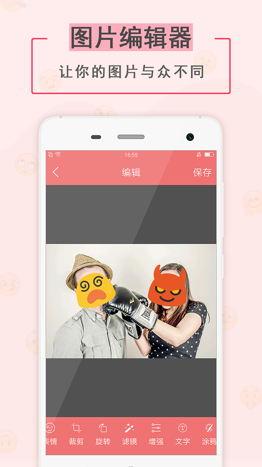 这是一款有趣好玩的相机应用,为你带来了海量的emoji表情贴纸,完美合成你的照片与emoji表情贴纸,让自拍从此萌萌哒,是你必备的卖萌贴图软件~