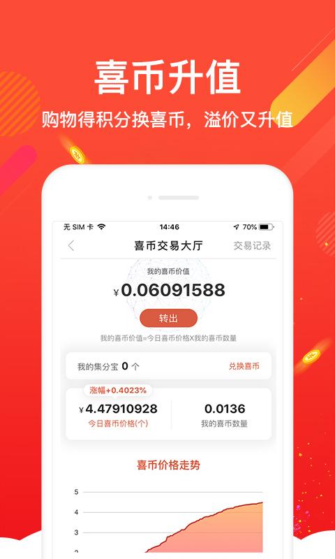 4、购物得积分即可兑换喜币升值赚收益。