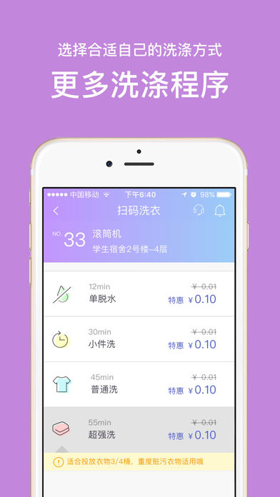 这是一款好用的自助的洗衣服务应用。帮助洗衣用户足不出户即可预约周边的自助洗衣机服务,现场扫码洗衣,洗衣用户可选择微信和支付宝进行支付,可实时查看洗衣倒计时,及时收到洗衣完成的信息提醒,更多功能请下载体验APP。