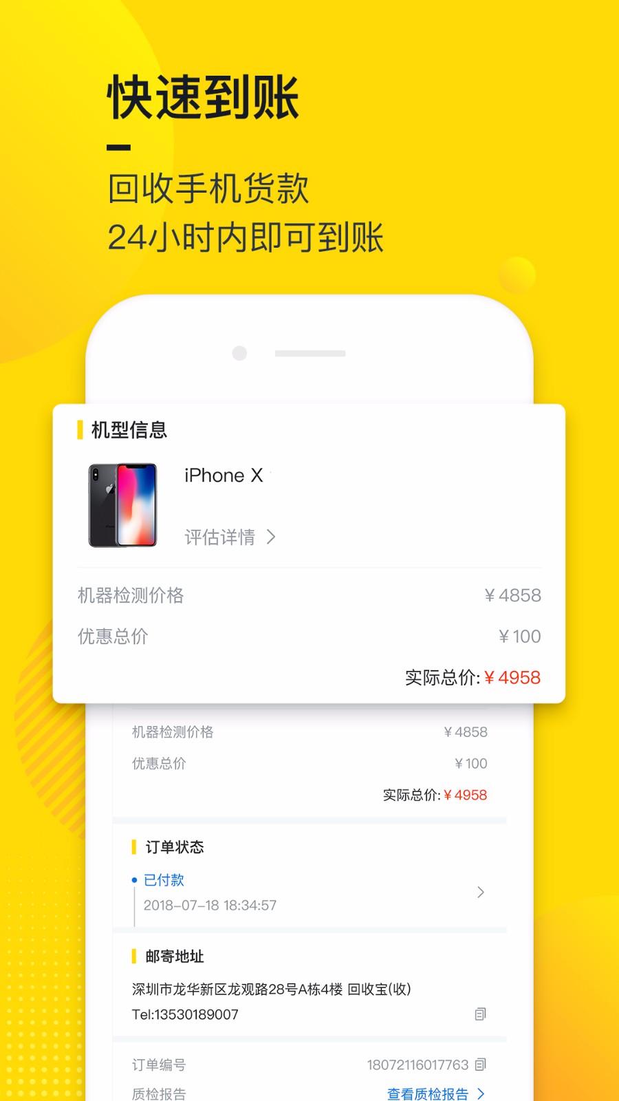 回收宝app是一款好用的二手手机的回收应用。提供了专业的回收流程,使您能够快速的回收闲置的二手手机。完善的保障服务,高价回收,让你的二手手机充分的发挥价值哦,欢迎下载使用吧。