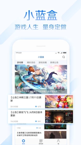 小蓝盒app是一款不错的游戏互动社区应用,广大的游戏玩家朋友们可轻松的通过该应用,获取到众多的最新游戏资讯,各类手游活动,海量的游戏礼包轻松领取哦。觉得不错的欢迎下载使用吧。