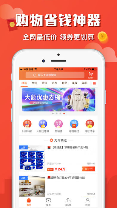 这是一款好用的优质实惠购物平台应用。致力让您收获实惠购物体验,提供众多的优质商品,可通过领取优惠券,进行实惠的购买。自买省钱分享商品还可赚取佣金哦,欢迎下载使用吧。