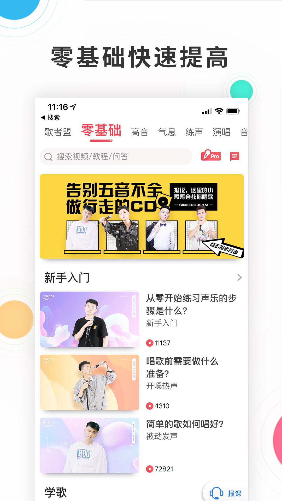 这是一款好用的唱歌学习应用,可以帮助广大声乐爱好者从零基础开始专业学习现代流行唱法的知识和技巧,通过练习逐渐进行入门提高。科学系统的为您解决高音上不去、低音下不来、气息不够用、音色不好听、唱歌容易累、感情不到位、五音不全等问题,全面提高你的唱歌水平。