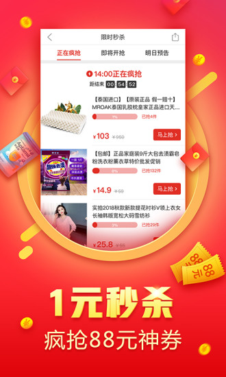 1、限时秒杀: 1元秒杀、9.9元抢购,每天多个场次秒杀,精彩多多!天天秒不停!