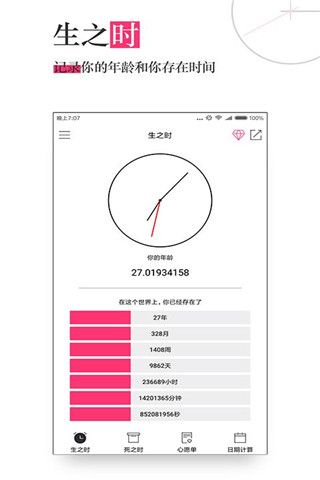 它会以非常特殊的方式记录您的生命时间、记录你的年龄等,准确到每一秒,让用户感受到生命时间的流逝,时刻提醒用户不要浪费光阴,珍惜时间,还可以将自己今年的心愿清单记录下来,来年翻阅回看。