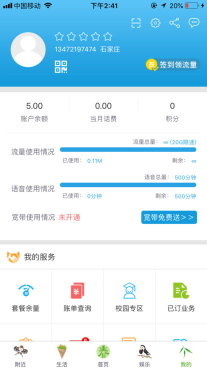 这是一款不错的自助服务移动端营业厅,提供方便快捷的账单查询、流量查询、话费充值、积分兑换、业务办理、流量购买、优惠活动、生活交费、娱乐休闲等功能一体的24小时在线的移动管家。
