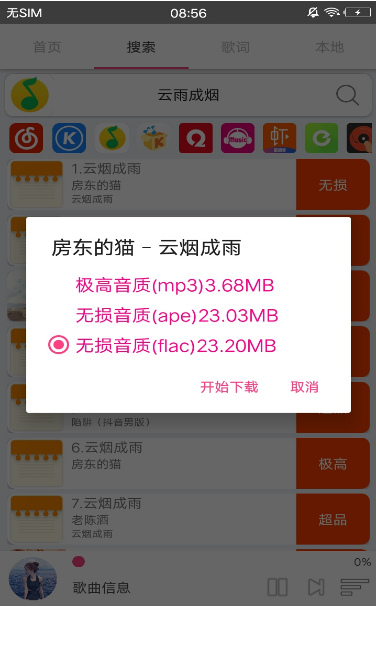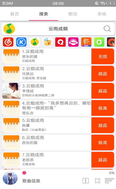 这是一款好用的音乐应用。听你想听的音乐,标准,极高,高品质,无损的四种音质给你选择。包含了网易,酷狗,QQ等等平台,有需要的朋友快来下载。