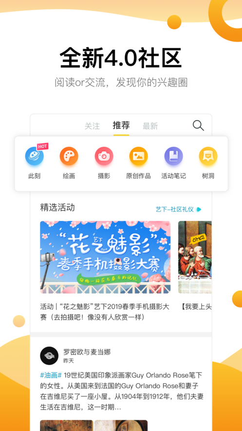 艺下app是一款好用的社交应用。以不同的兴趣为导向,多样的兴趣热点,轻松带你发现自己的兴趣所在。通过分享你的独立观点,找到能够懂你的人哦,快来下载使用吧。