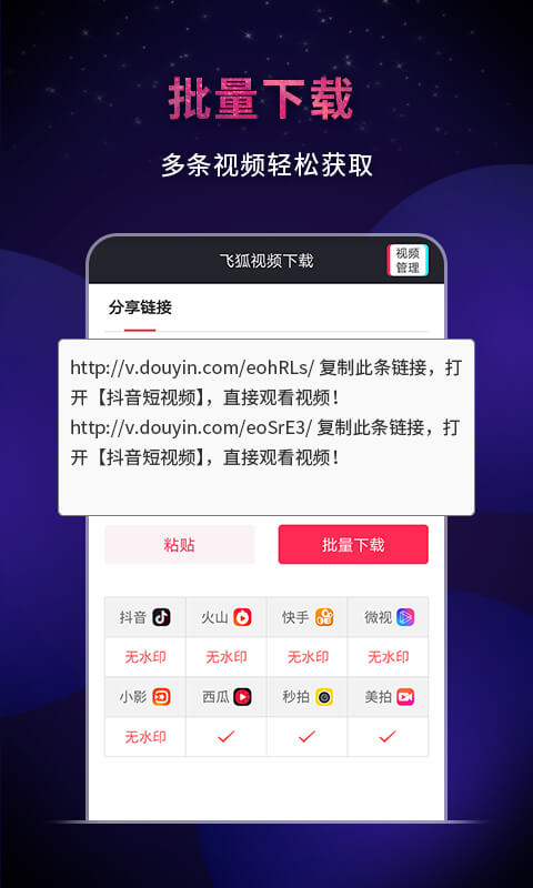 这是一款好用的视频解析下载应用。支持对多个主流的短视频平台的视频进行解析下载哦。批量的进行解析,多条视频一键获取。有需要的朋友欢迎来下载使用哦。