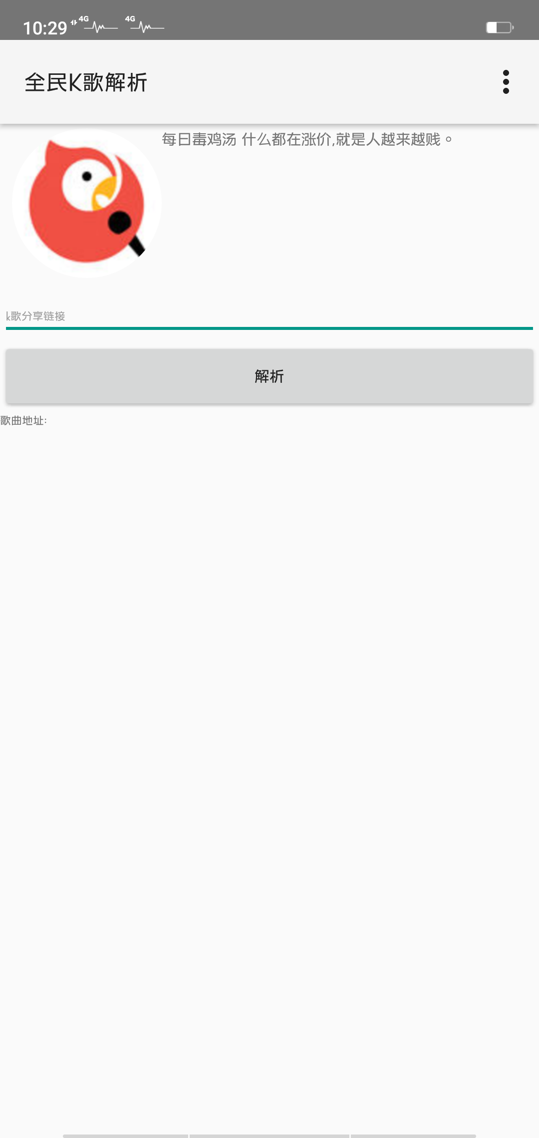 全民K歌解析app是一款非常实用的工具应用,碰到你喜欢的全民k歌中的歌曲,通过该应用,复制歌曲的链接,即可为您解析下载歌曲至本地哦。小巧工具强大作用,有需要的可以来下载使用。