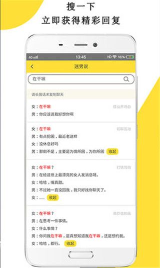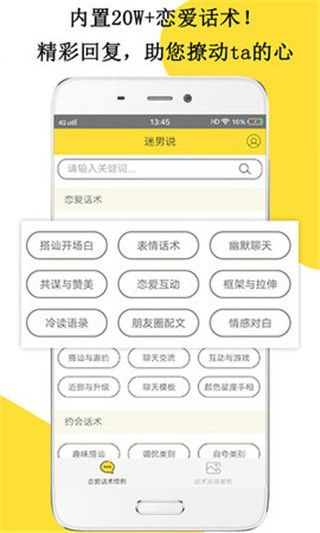 一款直男聊天话术撩妹指导软件,这里有超多的实聊案例和与女神相关的所有问题,1000+恋爱攻略,丰富的经典撩妹话术,帮您快速掌握聊天技巧,教你学会聊天。